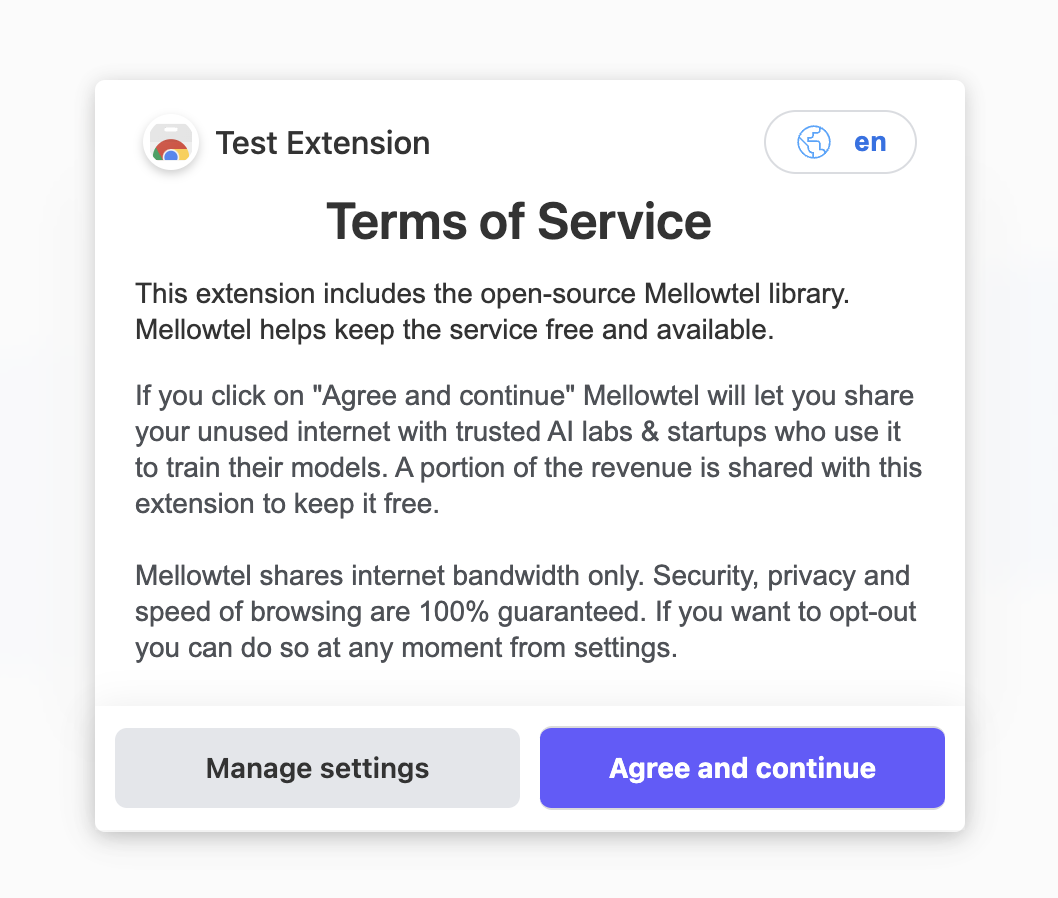 In order to activate Mellowtel users must give their explicit consent. The library provides a way to opt in or opt out. The core idea is that since it’s their Internet bandwidth, they should decide if they want to share it or not. This is why on the first installation/update with Mellowtel imported you must show a disclaimer/consent dialog that is not dismissible. Moreover, there must always be a clear way for users to change the settings at their convenience.